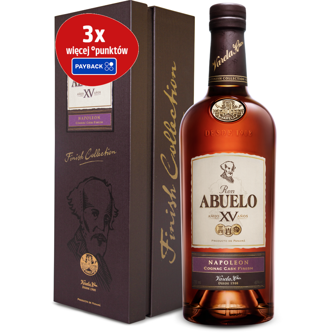 Abuelo 15YO Napoleon Cognac Cask Finish Panama Rum jest to rum o mahoniowym zabarwieniu pochodzący z Panamy, który dojrzewał w beczkach po francuskim koniaku. Abuelo XV Napoleon posiada bogate aromaty dojrzałych śliwek, kakao i rodzynek, wsparte palonym drewnem. Na podniebieniu jest gładki, intensywny i pełen suszonych owoców, dębowych nut, a finisz jest długi i czekoladowy. Firma Ron Abuelo Panama jest rodzinną firmą i od 1908 roku w 100% kontroluje proces produkcji swoich marek.