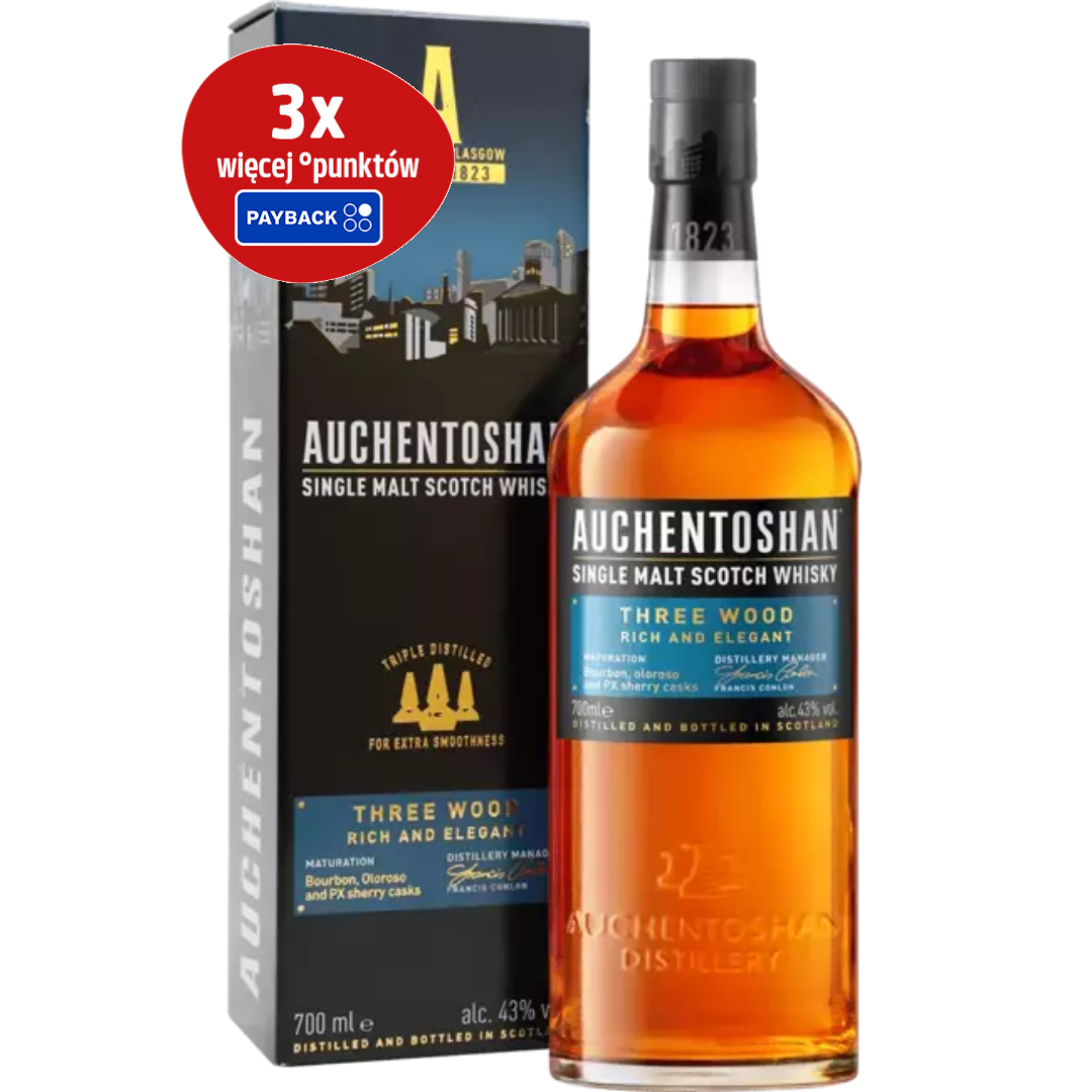 Auchentoshan Three Wood 43% 700ml podobno powstała przypadkowo podczas eksperymentów z beczkami po sherry. Kiedy 10-letnia whisky Auchentoshan została leżakowana w beczkach po bourbonie, zdecydowano ją przelać na rok do beczki po oloroso sherry, która znakomicie rozwijała jej aromat. Postanowiono zamówić więcej takich beczek i kolejna partia destylatu została napełniona nimi, a następnie połączona z pierwszą. Dopiero wtedy odkryto, że część z tych beczek została wcześniej użyta do leżakowania Pedro Ximenes, a nie jak wcześniej przypuszczano, do leżakowania oloroso. Mimo to, podjęto decyzję, aby pozostać przy tej kombinacji, w której whisky przez 10 pierwszych lat leżakuje w beczkach po bourbonie, następnie przez rok w beczkach po oloroso sherry, a kończy swoje dojrzewanie przez pół roku w beczkach po Pedro Ximenes. Whisky ma brązowo złoty kolor, a w jej zapachu można wyczuć aromaty czarnej porzeczki, brązowego cukru, pomarańczy, śliwek i rodzynek. Smak jest gęsty i owocowy, z nutką orzechów, cynamonu i cytryny. Całość dopełnia słodycz karmelu. Finisz jest świeży i owocowy, charakteryzujący się słodyczą płynącą z dębowych beczek.