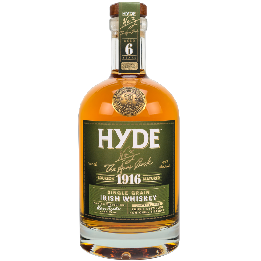 Hyde No.3 1916 Bourbon 46% 700ml to 6-letnia irlandzka whiskey single grain produkowana w małych partiach. Została destylowana trzykrotnie w kolumnach i dojrzewała przez co najmniej 6 lat w zwęglonych beczkach po bourbonie, pierwszego napełnienia. Butelkowana jest z mocą 46% i nie poddawana filtracji na zimno. W latach 1640 - 1962 rodzina Hyde była właścicielem znanego pubu "Tinker's Cross" na obrzeżach Bandon, w West Cork. W tym pubie sprzedawali irlandzką whiskey oraz piwo stout prosto z beczek. Choć Conor Hyde nie jest już właścicielem pubu, od 2014 roku kontynuuje tradycję butelkowania whiskey pod marką Hyde. Nazwa Hyde No.3 1916 Aras Cask odnosi się do rezydencji prezydentów Irlandii - Áras an Uachtaráin i nawiązuje do pokrewieństwa z pierwszym prezydentem Irlandii, Douglasem Hyde'em.