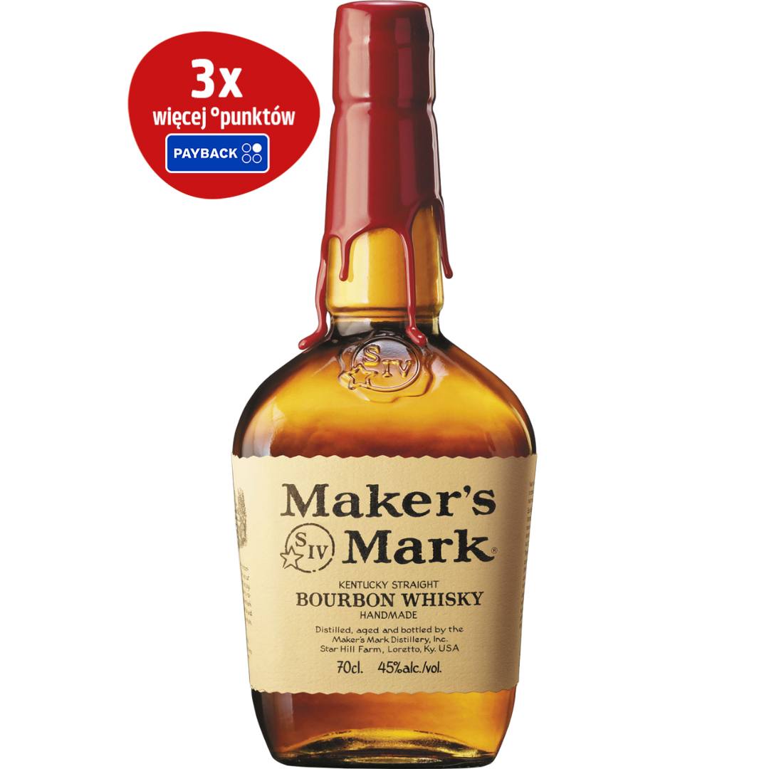 Maker's Mark 45% 700ml jest jednym z najbardziej popularnych bourbonów. Destyluje się go w Loretto w stanie Kentucky, a następnie rozlewany do charakterystycznych butelek z zawoskowanym korkiem. Whisky ta zadebiutowała na rynku w 1958 roku i szybko zdobyła aprobatę klientów. Nazwa tego bourbona została wymyślona przez Magie Samuels, żonę założyciela, która kolekcjonowała naczynia cynowe ozdobione znaczkiem "Maker's Mark". Samuels również zaprojektowała etykietę whisky oraz zaproponowała zanurzanie szyjek butelek w roztopionym wosku. Maker's Mark jest określany jako "pszeniczny bourbon", ponieważ jego przepis na mashbill zawiera ponad połowę kukurydzy, a pozostałą część stanowi pszenica z małym dodatkiem słodu jęczmiennego. Bourbon ten leżakuje przez około 6 lat w nowych wypalonych beczkach z amerykańskiego dębu. Aromat tego bourbona jest subtelny, z nutami wanilii, miodu, rodzynek, mlecznej czekolady, orzechów laskowych, cynamonu i gałki muszkatołowej. Jego smak jest łagodny i aksamitny, z nutami wanilii, brzoskwiń, miodu, tytoniu, kakao, pszenicy, daktyli, rodzynek i przypraw. Finisz jest długi i przyjemny, z akcentami dębu i karmelu.