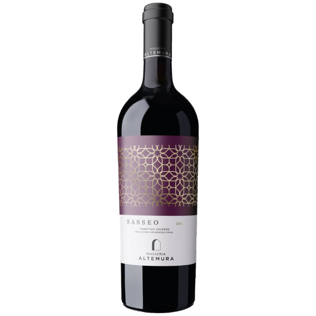 Masseria Altemura Sasseo Primitivo di Manduria DOC to wyraziste czerwone wino wytrawne z południa Włoch, stworzone z ręcznie zbieranych winogron szczepu Primitivo, dojrzewających w upalnym słońcu Apulii. Charakteryzuje się intensywną, głęboką rubi...