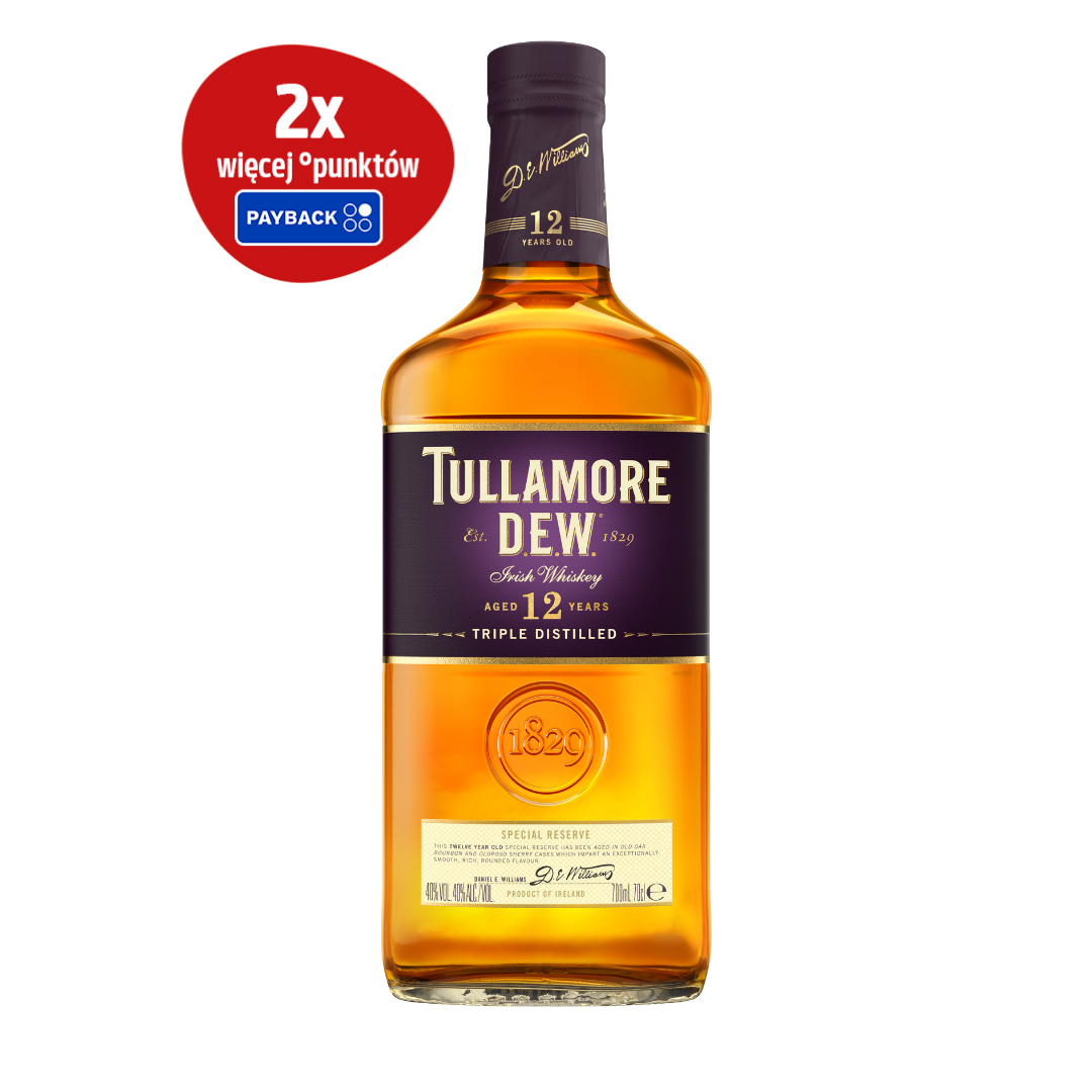 Tullamore D.E.W. 12 Year Old Special Reserve to starannie skomponowana mieszanka dojrzałej irlandzkiej whiskey o niepowtarzalnym charakterze. Swój kompleksowy i głęboki smak zawdzięcza procesowi leżakowania przez 12 lat w dębowych beczkach po bourbonie oraz sherry Oloroso. Koneserzy whiskey opisują tę wersję jako odpowiednio pikantną, ale jednocześnie łagodną, z wyczuwalnymi nutami cytryny i wanilii. Jej wyjątkowość potwierdzają złote medale zdobyte w prestiżowym konkursie World Spirits Competition oraz wiele innych cennych nagród i wyróżnień._x000D_ _x000D_ ZAPACH - Bogaty i ciężki aromat z wyczuwalną nutą miodu oraz rodzynek._x000D_ _x000D_ SMAK - Whiskey prezentuje głęboki smak przypraw, z wyczuwalną czekoladową nutą połączoną z delikatnymi suszonymi owocami i orzechami._x000D_ _x000D_ FINISZ - Posmak jest długi i bogaty, z akcentami cytrusów, czekolady, rodzynków i marcepana.